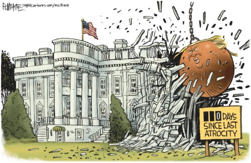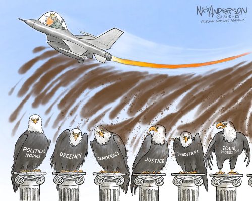 Adding to his show of disdain: while hundreds of thousands of federal workers go without paychecks, and with inflation and the price of groceries skyrocketing, Trump had the entire East Wing of the White House demolished – in violation of federal law – to erect a palatial, gilded, $300 million (and growing) ballroom … the worst damage to the White House since the British torched it in the War of 1812. Let them eat cake, Donald? And now he’s telling his Justice Department to pay him $230-million for the trauma of being investigated for his long string of crimes. The decision is up to two of his former personal attorneys: AG Pam Bondi and Deputy AG Todd Blanche, now his personal henchmen inside the DoJ.
